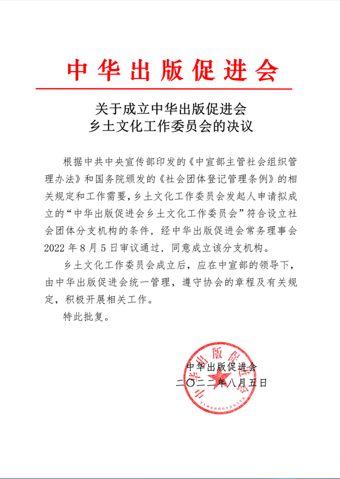 中华出版促进会根据业务开展需要,按中宣部、民政部管理规定,成立中华出版促进会乡土文化工作委员会(以下简称“分会”),1948年,费孝通在《乡土中国》中指出:“从基层上看去,中国社会是乡土性的”。吾土吾民 历久弥新。半个多世纪后的今天,伴随着工业化、城市化、市场化、全球化以及数字化,中国在现代化的进程中发生了巨变,开启了中华民族伟大复兴的历史篇章。中国的崛起,是一种文化的崛起,中国的复兴,也是一种文化的复兴。在传统意义上,费孝通关于乡土中国的考察与论述仍然具有时代意义,其奠定了认识和把握中华文化的基本共识。